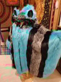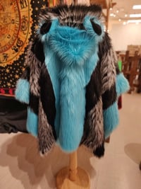Funky-fresh line of new colorful fun fur ponchos, hot off our sewing machine!