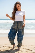 Relaxed harem style with elastic waistband and ankle cuffs.